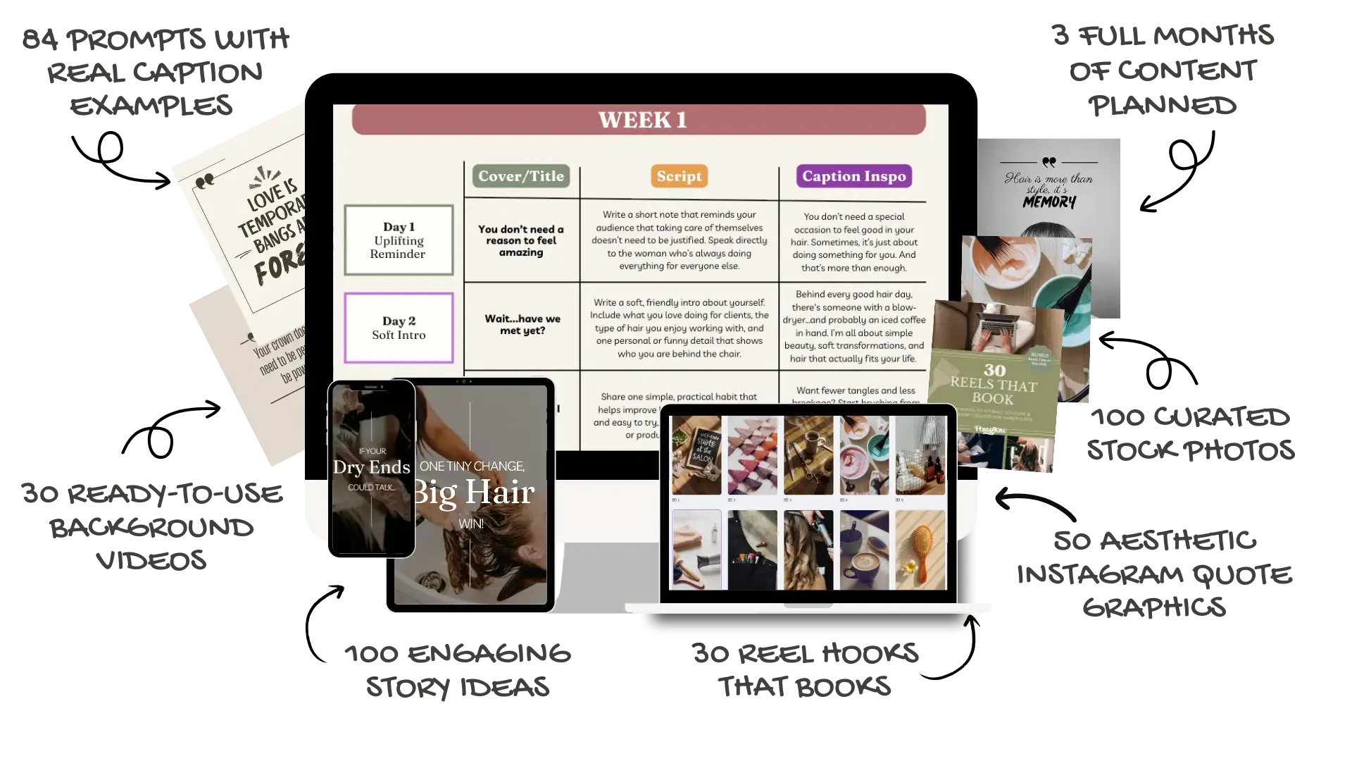 It’s a done-for-you content kit designed for hairstylists who want to stay consistent on Instagram. You’ll get 3 months of post prompts, caption guidance, Canva templates, stock photos, background videos, and much more, all ready to use.